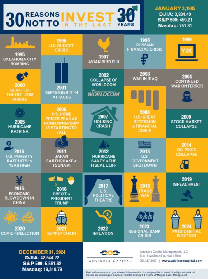 There have been so many negative news headlines and events over the last 30 years, way too many to count. The piece below from Advisors Capital Management gives you just 30 of them, but the good news is, if you ignored the urge the sell, you were rewarded handsomely by the markets: